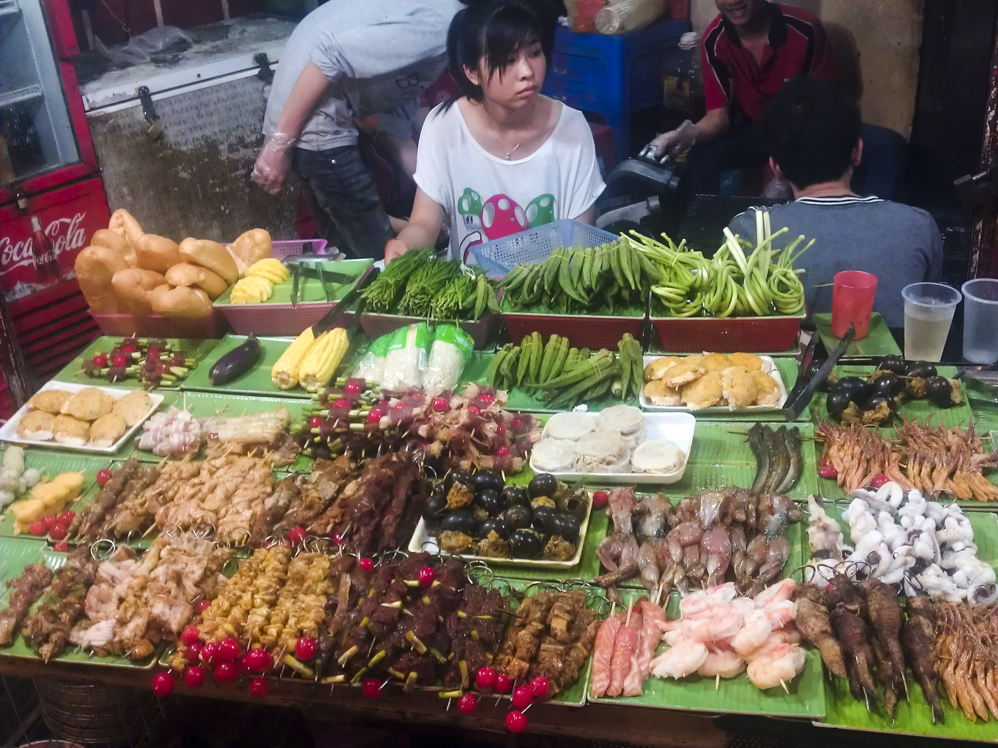 We had a long chat about the uniqueness of Vietnam. We found it amazing that people there eat almost at any time of the day and everywhere. So after a few beers, we walked around the old quarters to hunt for supper. We came across this barbeque joint where they apparently served “Chinese Barbeque”. On the stall laid different skewers of freshly marinated meat, seafood and vegetables. We ordered a few skewers and sat down. One of the specialties here seemed to be the baguette. Spread with lots of butter and later grilled until it turns into a sort of flatbread, it was rich and sinful. In fact, the meat were succulent and well-marinated. Here, the workers would grill the meat for you and serve them cooked. Which means they are not leaving to chance that you screw up the cooking process.